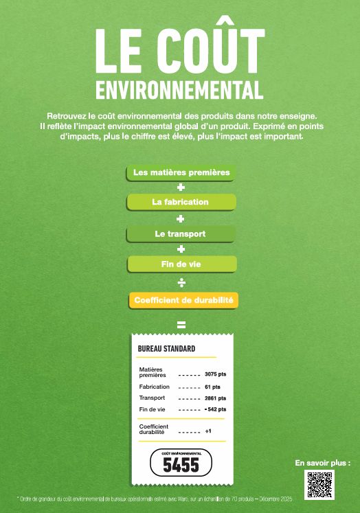 Dès 2009, nous étions les premiers à introduire une notation environnementale dans la distribution spécialisée. Aujourd’hui, nous franchissons une nouvelle étape avec le coût environnemental : un indicateur unique qui estime l’impact environnemental global de nos produits, de leur fabrication à leur fin de vie.